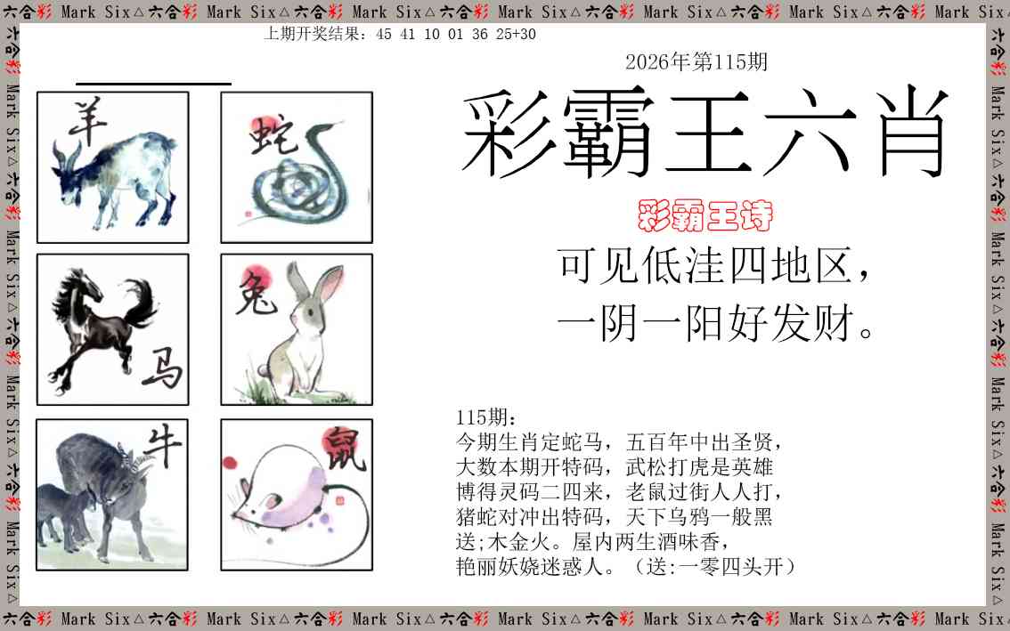 2026-115期正版彩图挂:01;挂牌:燕颔虎头;六肖:鼠蛇马鸡龙兔;火烧:猪